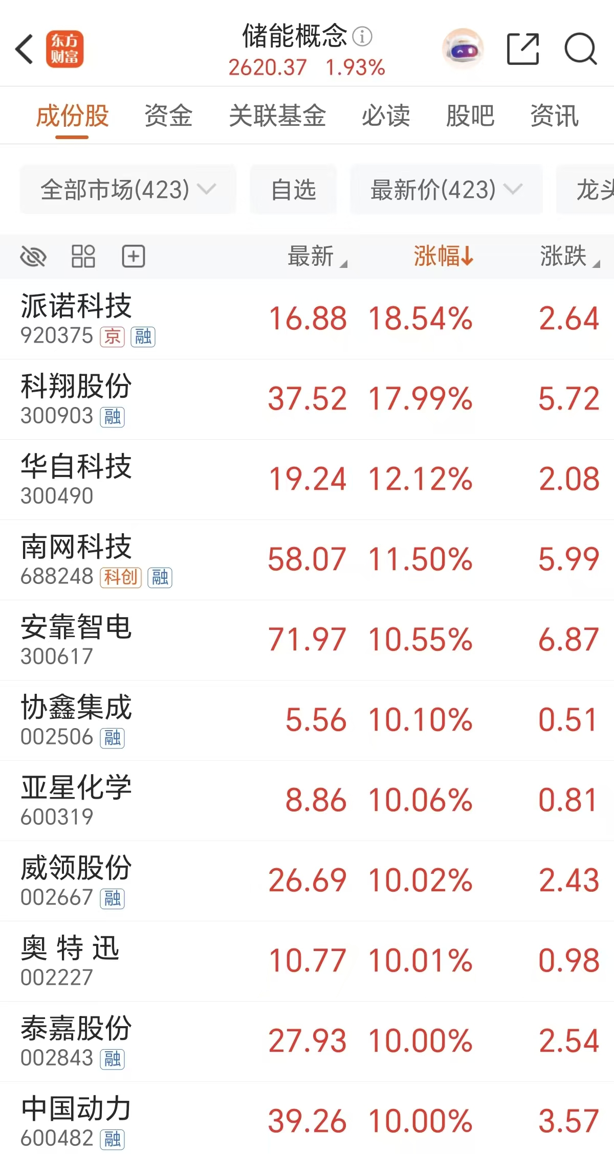 周五(3月6日)储能概念走强,派诺科技涨超18%,南网科技、安靠智电涨超10%,协鑫集成、奥特迅等涨停。