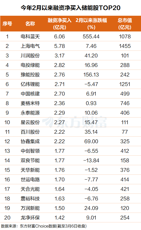东方财富Choice数据显示,自今年2月以来,杠杆资金净买入一批储能概念股。具体来看,电科蓝天排名第一,融资净买入超6亿元;上海电气排名第二,融资净买入5.8亿元。