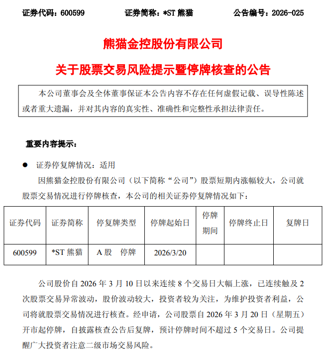 *ST熊猫3月19日晚间公告,公司股价自3月10日以来连续8个交易日大幅上涨,已连续触及两次股票交易异常波动,股价波动较大。为维护投资者利益,公司将就股票交易情况进行核查。经申请,公司股票自3月20日(星期五)开市起停牌,自披露核查公告后复牌,预计停牌时间不超过5个交易日。
